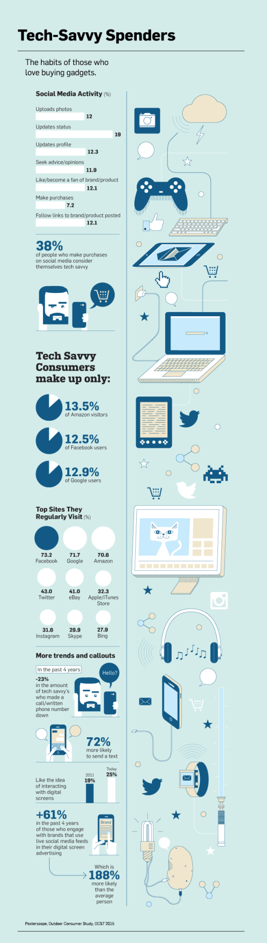 Each year, Dentsu’s out-of-home agency Posterscope conducts its Outdoor Consumer Study that zeroes in on a range of sought-after demographics. Tech-savvy consumers—people who describe themselves as such, love to buy tech gadgets and also give tech-related advice—are among the most coveted.