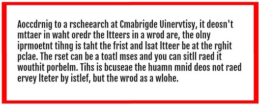 “According to a researche [sic] at Cambridge University, it doesn’t matter in what order the letters in a word are, the only importent [sic] thing is that the first and last letter be at the right place. The rest can be a total mess and you can still read it without problem. This is because the human mind does not read every letter by itself but the word as a whole.”